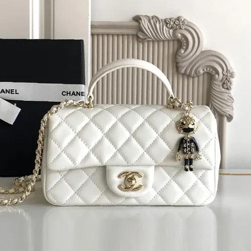샤넬 CF 뉴미니 램스킨 내장칩 탑핸들 화이트 금장참 20CM #AS2431
