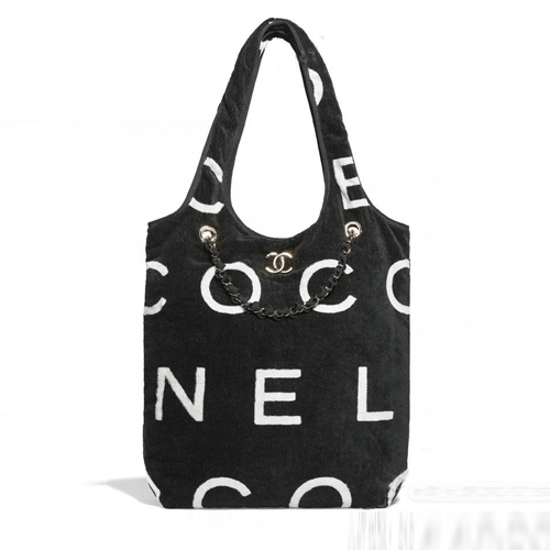 CHANEL 2023 COCO BEACH 라인으로, 부드럽고 촘촘한 질감의 순면 타월 원단으로 제작된 비치백입니다. 블랙 바탕에 화이트 CHANEL 로고가 큼직하게 새겨져 있으며, 가죽과 체인을 엮은 숄더 스트랩이 포인트입니다. 넉넉한 수납공간으로 여행이나 여름철 비치용으로 적합하며, 가볍고 유연한 촉감이 특징입니다. 내부에는 지퍼 포켓과 로고 패치가 부착되어 있습니다.