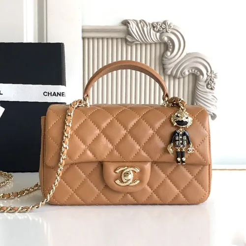 샤넬 CF 뉴미니 램스킨 내장칩 탑핸들 브라운 금장참 20CM #AS2431