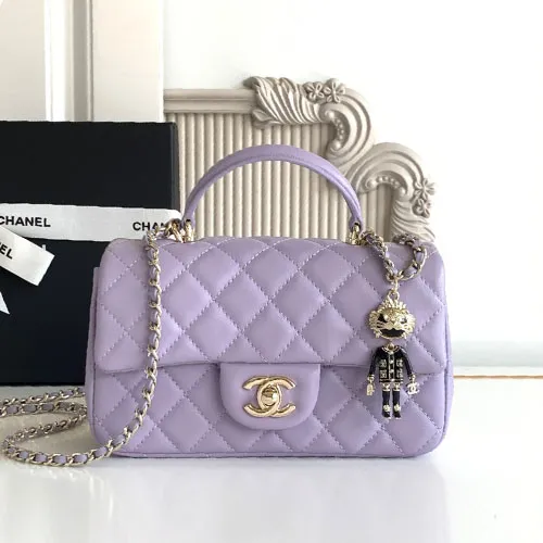 샤넬 CF 뉴미니 램스킨 내장칩 탑핸들 퍼플 금장참 20CM #AS2431