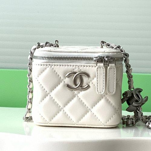 25B 신상 화장품백으로, 부드럽고 고급스러운 양가죽 소재에 생선 비늘 같은 질감이 특징입니다. 진주빛 로고와 더블 C 잠금장치가 포인트로, 섬세하고 고급스러운 디자인을 자랑합니다. 작고 귀여운 사이즈로 어떤 옷에도 잘 어울리며, 손에 들거나 어깨에 걸었을 때 매우 세련된 분위기를 연출합니다.