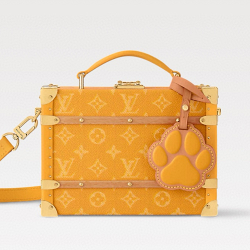 이 루이 비통 핸들 트렁크 백은 M12458 모델로, 파스텔 옐로우 색상의 모노그램 헤리티지 캔버스 소재로 제작되었습니다. 전통적인 다미에(Damier) 패턴의 디테일과 퍼렐 윌리엄스(Pharrell Williams)의 초기 작품에서 영감을 받은 경위직(warp and weft) 질감이 특징이며, 마르켈.비통 데포제(Marquel.Vuitton Déposée) 로고가 모노그램 패턴을 새롭게 해석합니다.