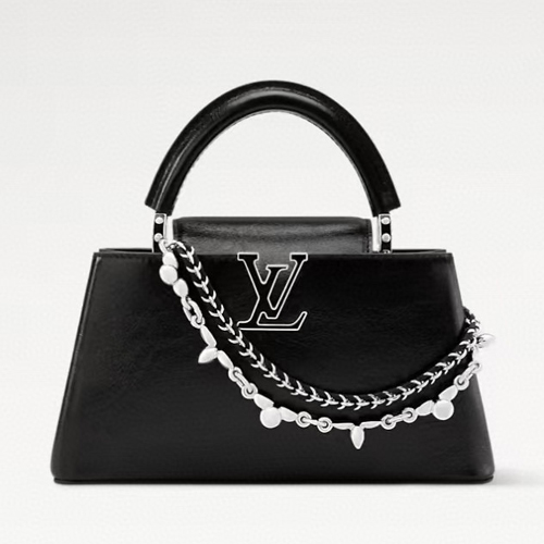 루이 비통의 카퓌신 이스트-웨스트 미니 핸드백은 블랙 왁스드 가죽으로 제작되어 세련되고 고급스러운 매력을 선사합니다. 뷰티 컬렉션에서 영감을 받은 색상과 디자인으로, 우아하면서도 현대적인 감각을 동시에 표현합니다. 가방 전면에 자리한 시그니처 LV 이니셜과 탈착 가능한 실버 톤 체인 장식이 돋보이며, 다양한 스타일 연출이 가능합니다.