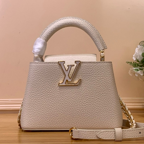 “Capucines Blanche Rêverie(카퓌신 화이트 드림)” 시리즈에서 탄생한 “Capucines Mini” 백은 세련된 우유빛 화이트 컬러에 진주 자개 장식으로 고급스러움을 더했습니다.