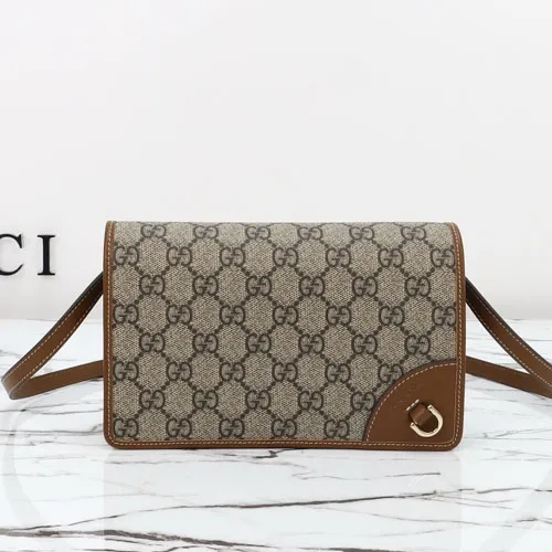 GUCCI 구찌 GG 엠블럼 레더 스트랩 디테일 월렛백 브라운
