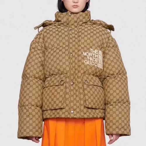 가장 핫한 GG × 北面(노스페이스) 콜라보 제품으로, 탈부착 가능한 후드와 클래식한 GG 패턴이 특징입니다.