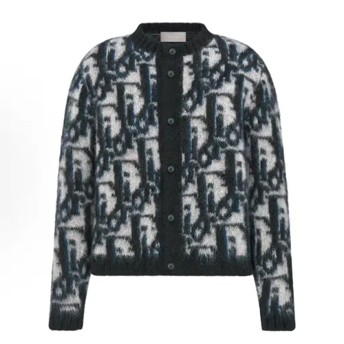 빈티지 감성이 돋보이는 Dior의 신상 카디건입니다. 정교한 단추 디테일과 클래식 자카드 로고 패턴이 특징이며, 고급스러운 질감이 느껴집니다.