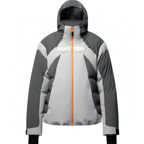 루이비통 LV3390 가을 겨울 스키 패딩 점퍼입니다. 회색과 흰색의 조화로운 색상 대비가 돋보이며, 전면에는 루이비통 로고가 크게 프린팅되어 있습니다. 후드가 달려있어 보온성을 높였으며, 스키복으로 활용하기 좋은 기능성 소재로 제작되었습니다.