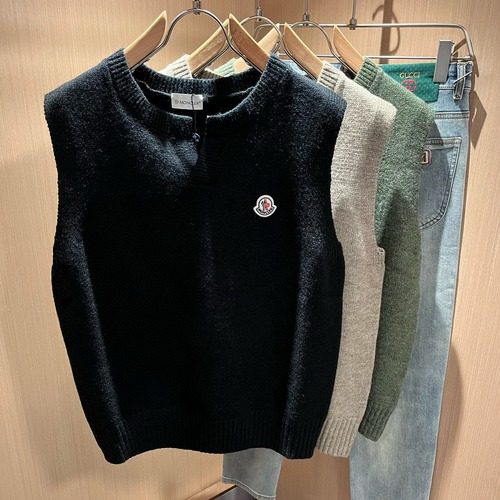 Moncler 2025 F/W 시즌 남녀공용 커플 니트 베스트로, 최신 무역 오더라인 제품입니다. 고급 울 혼방 니트 소재로 제작되었으며, Moncler 시그니처 로고 자수로 포인트를 더했습니다. 전체적으로 부드럽고 입체감 있는 짜임이 돋보이며, 품질은 수출용 오더 수준으로 매우 우수합니다.
