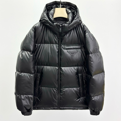 PRADA의 남성용 후드 다운 재킷입니다. 탈부착 가능한 후드가 있어 다양한 스타일로 연출할 수 있습니다.