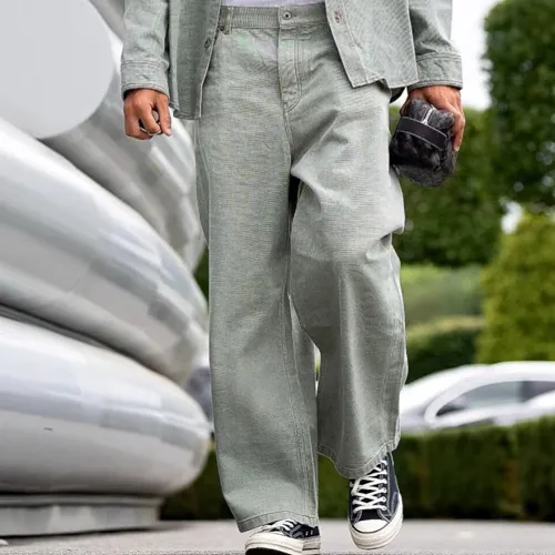 Loewe 카키 그린 컬러의 워시드 코튼 데님 팬츠입니다. 여유 있는 와이드 핏과 표준 기장으로 제작되어 트렌디하면서도 편안한 착용감을 제공합니다. 중허리(Hip-rise) 디자인과 직선적인 실루엣이 세련된 무드를 더하며, 히든 지퍼 플라이와 5포켓 디테일로 실용성과 완성도를 높였습니다. 뒷면에는 Loewe의 Anagram 로고 가죽 패치가 장식되어 브랜드 아이덴티티를 강조합니다.