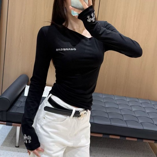 25년 초가을 신상 시리즈로, 크롬하츠 특유의 로고가 큐빅 장식으로 새겨진 브이넥 긴팔 상의입니다. 독특한 넥라인 디자인으로 목선을 아름답게 강조하며, 부드러운 원단으로 편안한 착용감을 제공합니다. 고급스러운 광택감이 있으며, 몸에 자연스럽게 핏되어 여성스러운 실루엣을 연출합니다. 두 가지 컬러로 구성되어 있으며 S/M/L 사이즈로 출시되었습니다.