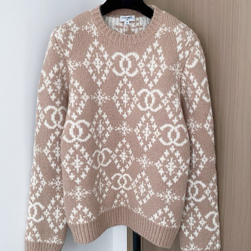 Chan 25 신상 투톤 니트 스웨터입니다. 은은한 투톤 컬러감과 샤넬 로고 패턴이 전체에 짜여 있으며, 소재가 통기성이 좋고 부드러워 착용 시 고급스러운 분위기를 연출합니다. 네크라인과 소매, 밑단은 리브 처리되어 늘어남을 방지합니다. 컬러는 베이지와 핑크 2가지이며, 3가지 사이즈가 제공됩니다.