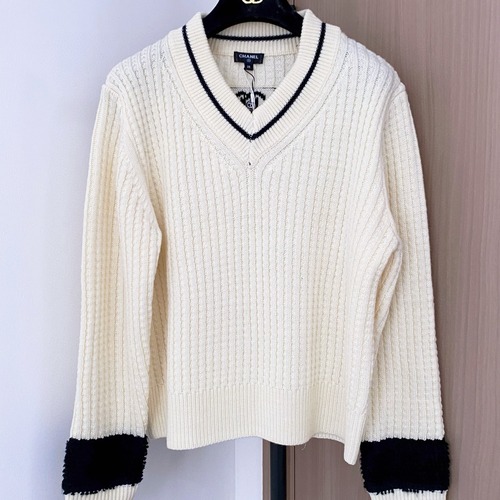 Chanel 샤넬 블랙 화이트 배색 니트 브이넥 스웨터