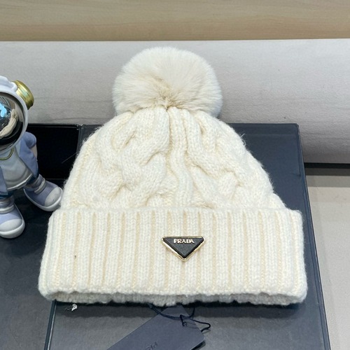 고급스러운 프라다 삼각 로고와 부드러운 폭스퍼 볼이 포인트인 여성 니트 비니입니다.